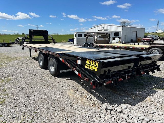 A 25 + 5 setup with Maxx Ramps, dual tandem and 10k Dexter axles, along with spread axles, HDSS suspension, and a torque tube for added strength. It’s built with a pierced‑beam frame design and includes pipe spools, stake pockets, mud flaps, a custom sealed wiring harness, a chain rack on the rear of the neck, and load/work lights. A spare is included. $15,400 on the road.